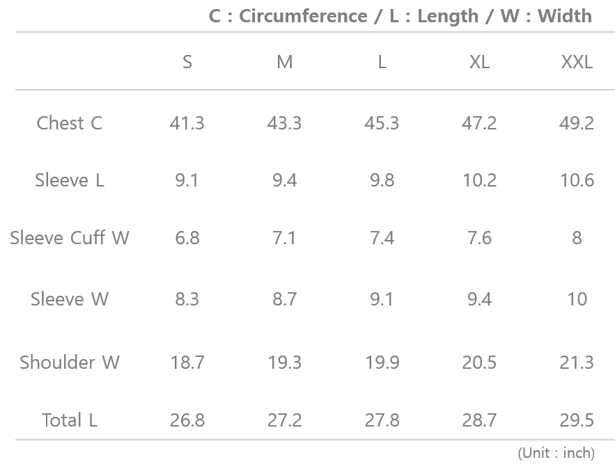 | Chest (inch) | 34 | 36 | 38 | 40 | 42 | 44 | 46 | 48 | |