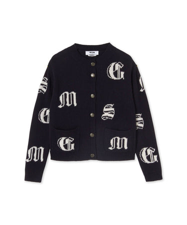 The silhouette emphasizes a sense of femininity and youth: a new gothic logo decorates the inlaid knitwear. Cardigan with rounded collar and long sleeves, front closure with contrasting buttons, ribbed hems with contrasting color finish.