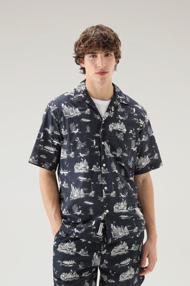 A lightweight, on-trend design that will see you through the season in style and comfort. This short-sleeved shirt is made of pure cotton poplin and features a vintage-inspired camp collar and a print of Zavikon Island honoring Woolrich's connection to its roots. It has a button closure and a patch pocket on the chest. It also has a dedicated label that honors Zavikon Island.
