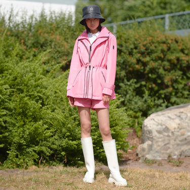 MELANY is a mid-length rain parka featuring a removable bib with an adjustable storm visor hood. Crafted from a 100% recycled 2-layer water resistant shell, it flaunts a semi-fitted cinched silhouette with a drawcord waist. Cuff tabs and dual-entry zip pockets lend further adaptability. Perfectly tailored, a sleek style with high-function.
